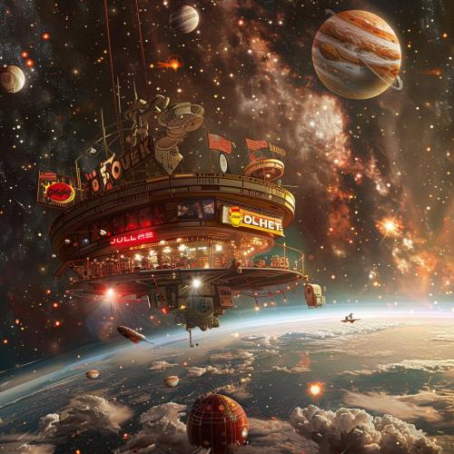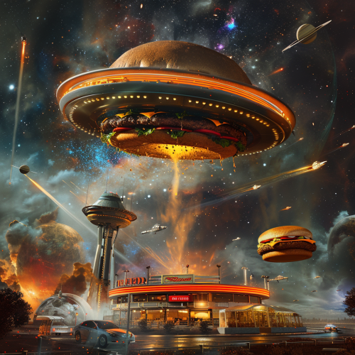 burger king fast food restaurant on galaxy, aliens and ufo, realistic