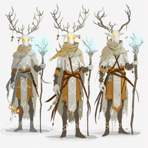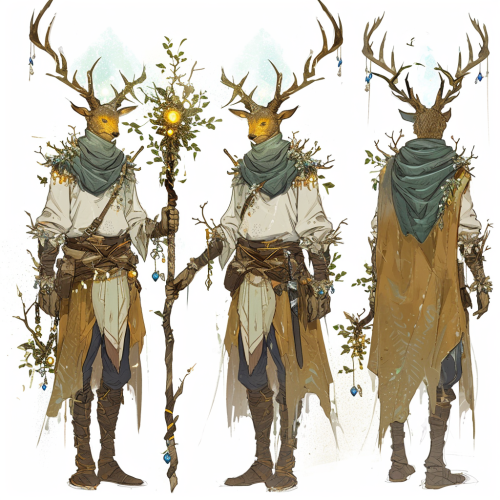 character sheet of 3 full-body, Staff imbued with the spirit of the deer guardian, Forest Wizard, Game character concept design, Illustration, white background, simple detai --v 6.0