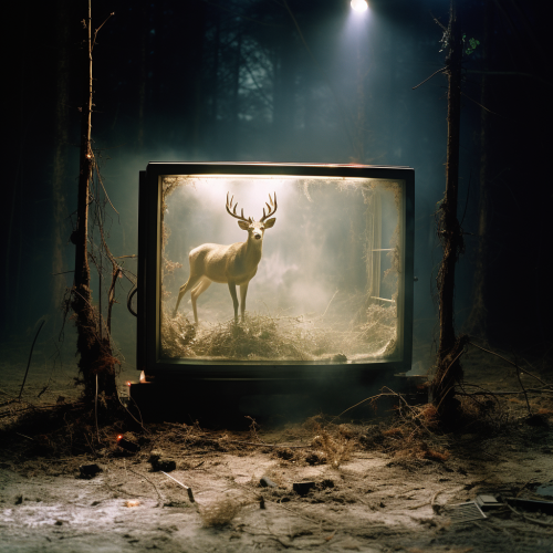 on the proctor screens in which there is a different reality, on the stage there are old televisions from which a dead body of deer comes out, all in smoke, many different light sources on the stage