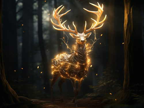 full body big deer dynamic moving, forest spirit, hiding between trees, guardian and spirit of the forest, beautiful big horns, deer's fur is a shimmering brown color, and it changes hue depending on the light, it shimmers with brown and silver highlights. In the moonlight, it takes on a silvery sheen, the deer's body is tall and slender, and it is perfectly proportioned, the deer's legs are long and graceful, and its hooves are sharp and black, deer's eyes are deep and knowing, eyes are a bright emerald color, and they are flecked with gold, The deer's antlers are vast and intricate, and they are made of a pure colorful material that resembles ivory. The antlers are adorned with magical runes and symbols, and they glow with a soft magical light, forest background, beams of light, ultradetailed, lens flares --ar 12:9