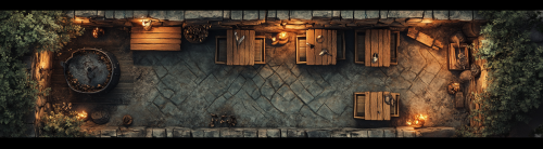 magical forge workshop with a forge on one side, three tables side by side in the middle, and a storage room on the right hand side, top down view, dnd style --ar 18:5