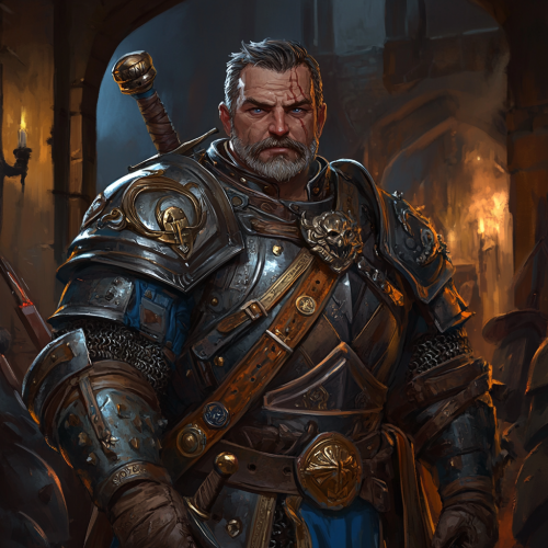 A veteran warrior and master weaponsmith, with a strong, muscular build and broad shoulders. He has short, graying hair with a neatly trimmed beard, and piercing blue eyes that show wisdom and experience. Dressed in a custom-forged leather and metal armor with intricate designs, he carries a blacksmith's hammer and a sword at his side. His armor is worn but well-maintained, and he wears a rugged cloak. His presence is both imposing and reassuring, with a calm but commanding demeanor. In the style of a Disney character, colorful but with a gritty and heroic edge, standing confidently in his forge surrounded by weapons and tools.