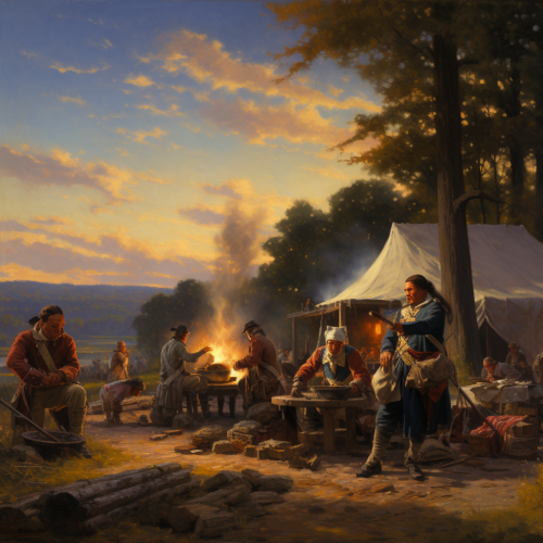 Create a painting of the Colonial camp at Valley Forge that captures the essence of an iconic American landscape, perhaps a serene scene along the Delaware River or a tranquil countryside. The artwork should be influenced by the styles of John Trumbull, Frank Bramley, Pompeo Batoni, Anthony van Dyck, N.C. Wyeth, Thomas Lawrence, and Ray Donley. Embrace the techniques of uhd imaging, solarization effect, representational art, and restrained expressionism. The color palette should predominantly feature navy, brown, dark yellow, light crimson, light red, and frequent touches of yellow. Integrate elements of classic Americana, photobash, icepunk, and rangercore for a harmonious blend. The atmosphere should exude a cold and detached feel, yet maintain a sense of iconic reverence. Aim for a resolution that captures the detail and depth reminiscent of 8k to 32k uhd quality.