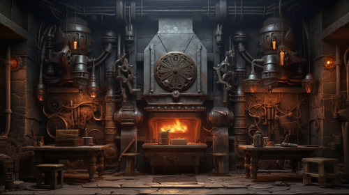 fantasy illustration of a blacksmith with clockwork arms holding a large hammer, he has short cropped brown hair and grey eyes, the background in a forge