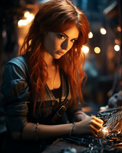 : A woman, magical blacksmith, fiery red hair, muscular build, night, she is wearing a crop top and has open knees, in a forge filled with glowing weapons, firelight, hdr, surreal --s 1000 --chaos 50 --ar 4:5