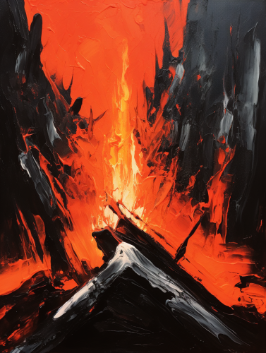 low angle, a forge hammer striking lava, forge of mountain cavern,Bold brush stroke acrylic painting style , acrylic touch --ar 3:4