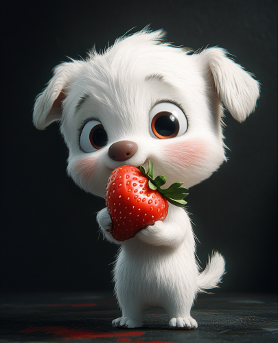 black background. a humorous white puppy with bulging eyes pulls a piece of strawberry. Pixar engine, cartoon caricature design. --ar 179:220 --stylize 250 --v 6.1