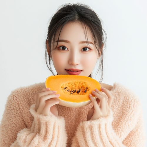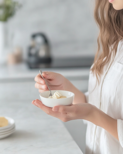 Medium shot of a woman with a minimalist background, holding a small dessert in a white porcelain dish, eating with a tiny spoon, set in a bright, modern kitchen with smooth surfaces and soft pastel tones, clean background trending, shot with a Leica Q2, 28mm lens, bright natural light, soft shadows, minimal color palette --ar 4:5 --style raw
