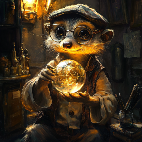 A hungry middle-aged humanoid meerkat wearing glasses and a cap is trying to swallow the Palantir, which is a magical orb from the movie The Lord of the Rings. realism