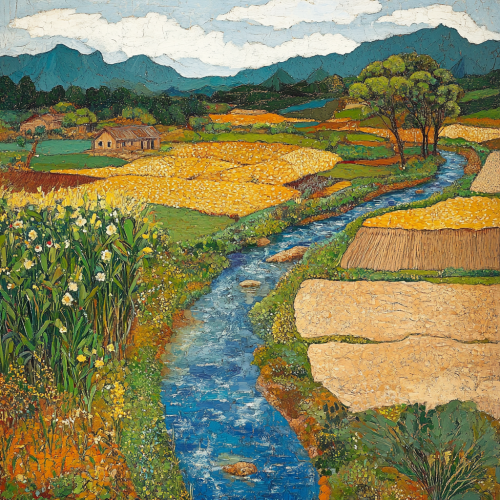 Millet style The rural farm land with a small river ,embodies the qualities of soft, fertile soil that nurtures and nourishes life. It resonates with the Yin aspect of the Earth element.