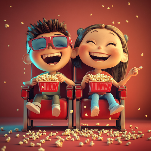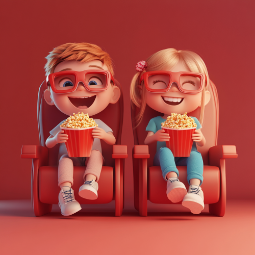 little boy and girl, age 10, dark hair and eyes, having fun,hand pointing front, laughing, happy, sitting together on a red cinema chair, side by side, eating popcorn together, wearing 3d glasses, plain background, cute, animation, cartoon, 3d, pixar style, popcorn spilling around, popcorn around