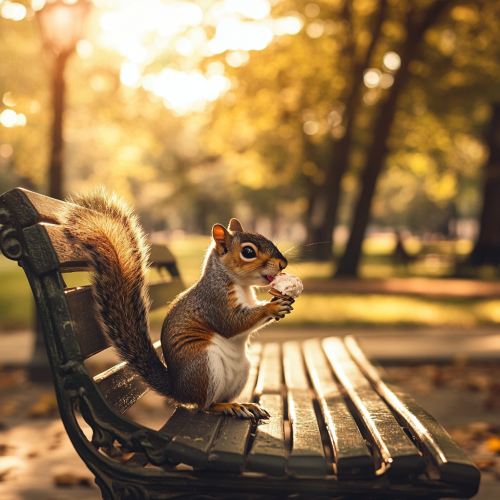Capture the playful essence of a squirrel eating icecream while sitting on a park bench, inspired by the whimsical world of Pixar animation. The photograph showcases the squirrel sitting on a park bench, swinging its feet while eating delicious ice cream. Against a vintage backdrop of a sunlit park with oak trees. The image is beautifully composed, with the squirrel occupying the center of the frame and the surrounding environment, adding depth and context. The photograph captures the joy and spontaneity of the moment, inviting viewers into a world where imagination knows no bounds, UHD, 16k, retina