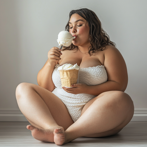 an obese woman is sitting on the floor, holding a large 3 kg package of ice cream and hurriedly eating it with a large spoon right out of the package --style raw