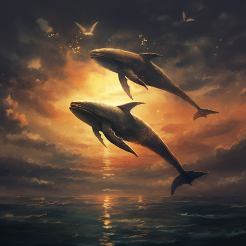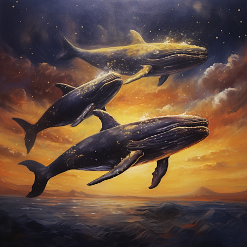 realism style painting of three whales flying around sky, stars and planets in the background, golden sunset, millet style, style raw