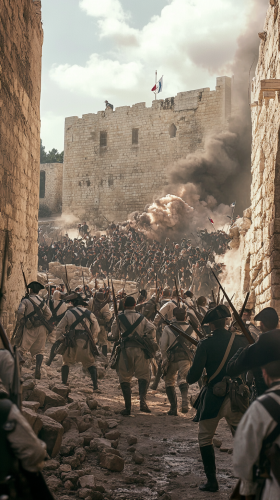 take the city of Jaffa, Palestine, a chaotic scene of French soldiers entering the gates of Jaffa, 1799, wearing French military uniforms with muskets and swords, at the city walls of Jaffa, crumbling stone walls and a crowd of fleeing civilians in the background, wide shot emphasizing the scale of the invasion, hyper-realistic, photo realism, cinematography --ar 9:16