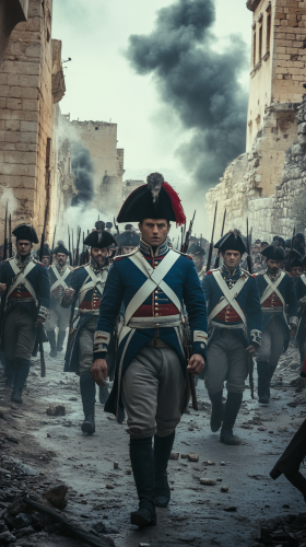 Napoleon Bonaparte's troops, a group of determined French soldiers led by Napoleon in a military uniform, 1799, wearing French Revolutionary military attire with blue coats and bicorn hats, in a war-torn city of Jaffa, advancing through narrow streets, smoke rising and damaged buildings in the background, medium shot capturing the intensity and focus of the soldiers, hyper-realistic, photo realism, cinematography --ar 9:16