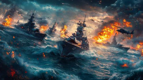 Cold winter scene near Vladivostok, Russia on February 22, 1953, amidst the final days of Stalin’s rule. The foreground shows snow-covered military outposts with soldiers patrolling the perimeter, reflecting the region’s strategic importance. In the background, the icy Sea of Japan glistens under a cold, overcast sky, with naval ships visible in the distance. The lighting is dim and chilly, capturing the tense atmosphere of this militarized and remote area. --ar 16:9 --v 6.0 --style raw