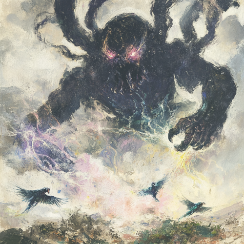 An epic battle in the stormy skies, featuring Lifedrinker, a colossal, shadowy, monstrous entity twice the size of the Burj Khalifa, with dark, crackling tendrils reaching out in all directions. Its body is amorphous, covered in a swirling, smoky mist, with glowing, malevolent eyes and faintly visible, shifting patterns that resemble cosmic voids. Opposing it are three massive Thunderbirds, mythical avian creatures with wingspans like commercial airliners. Their feathers shimmer in electric blues and silvers, their eyes glow with an unearthly light, and they are surrounded by arcs of lightning as they dive and attack. The scene is set against a dark, stormy sky, with clouds churning and lightning illuminating the chaos. Lifedrinker’s tendrils lash out towards the Thunderbirds, while one Thunderbird unleashes a bolt of lightning at the creature's core. The landscape below shows cracked earth and patches of glowing dark energy, hinting at the creature's destructive power. The atmosphere is tense and dramatic, capturing the clash between ancient mythical forces and a terrifying, otherworldly monstrosity. --sref 8282024