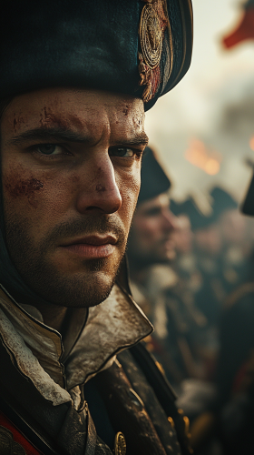 5. the French soldiers showed no mercy, a focused view of French soldiers with stern expressions, 1799, in military attire, in a dimly lit square, smoke and distant shouts in the background, close-up shot highlighting the intensity of their faces, hyper-realistic, photo realism, cinematography --ar 9:16