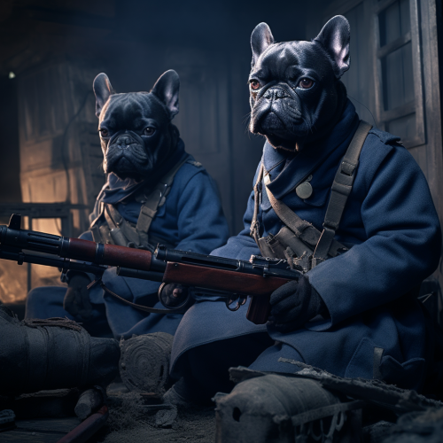 humanoid french bulldog dogs as french world war 1 soldiers in historical dark blue uniforms coats sitting in trenches with guns