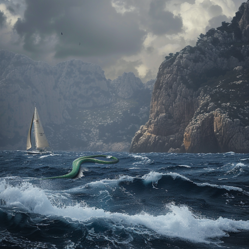 a sailing boat with the shape of green snake, sailing in cape formentor mallorca, stormy day, big waves