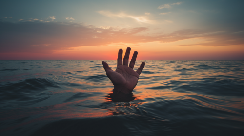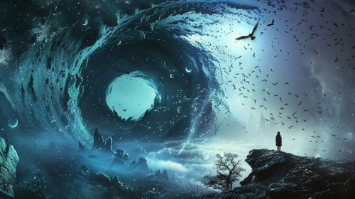 At the edge of a dark and hazy space, a man stands with his eyes closed and his palms up, as if he is asking for something in prayer. Behind the person, paintings wrapped in light stretch out of the darkness: such as a family home, a tree full of fruit, a successful workplace or any other figure that represents his dreams and passions. As the wishes and dreams become bigger and more overwhelming, the light inside the paintings becomes brighter, as if indicating that the dream is the source of the light that spreads and brightens the surrounding darkness. In the background, you can see the sun starting to rise, symbolizing the possibility of a new day, full of hope. photograph --ar 16:9 --v 4