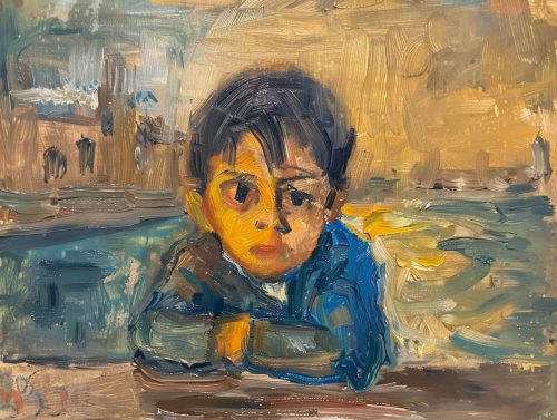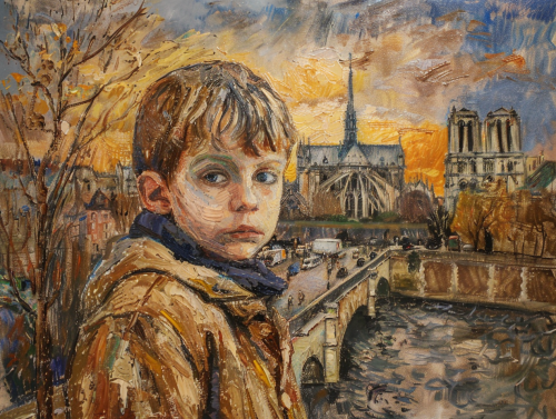 enfant avenir sur fond de cathedrale, oil historical paint py picasso --ar 4:3