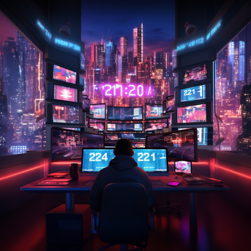 "Create an image of a high-tech control room with multiple screens, one of which prominently displays a progress bar at 99% with '2024' flashing in neon lights. The room is filled with a celebratory atmosphere, with digital streamers and a futuristic cityscape visible through the windows."