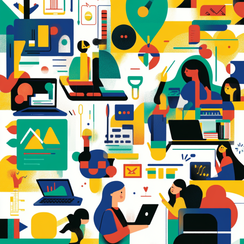 Create a vibrant, clean vector-style illustration depicting the process of selecting a Learning Management System (LMS) for schools. Include elements such as a diverse group of teachers and students discussing options, laptops displaying various LMS platforms, colorful icons representing features like communication, assessments, and content sharing. Use a bright and engaging color palette with simple geometric shapes and smooth lines to convey a sense of collaboration and modern education.