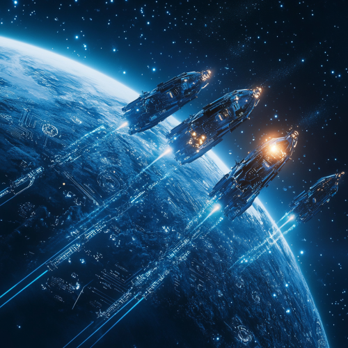 a 5 comets flying through space that have different names on them. Lead management, Decision Engine, Loan Managemnent System, Business Intelligence, Payment Processing - flying towards a pulsating planet thats ready to exmple full of tech circuitry