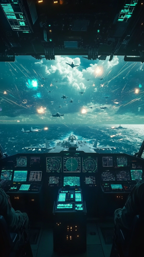 The control tower of the USS Dwight D. Eisenhower, with officers coordinating hundreds of sorties in the middle of the ocean, radar screens glowing, and jets soaring into the sky, surreal, hyper-realistic, Ultra HD --ar 9:16