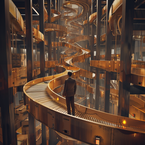 Conveyor belts taking delivery packages in and endless loop that looks like the endless staircase, a manager looking stressed, alarms flashing, brown and gold --v 6.0