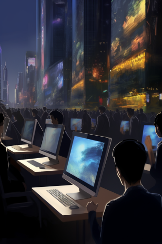 management, technocracy, control, technic, computer screens, dystopia, symbolism --s 10 --c 15 --ar 2:3