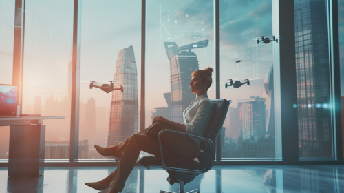 A sleek, modern real estate agent relaxing in a stylish office, while AI-driven drones deliver customer profiles directly to their desk. The agent smiles confidently, surrounded by holographic displays and futuristic gadgets. The city skyline is visible through large glass windows. Created Using: futuristic realism, sharp lighting contrasts, hd quality, dynamic technology elements, soft shadows, ultra-modern office design --ar 16:9 --v 6.0