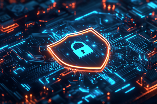 Create a zoom out highly detailed and hyper-realistic visualization of a cybersecurity concept. Show a futuristic, glowing shield with a padlock in the center, representing data protection. The shield is integrated into a digital circuit board, surrounded by intricate, glowing blue and neon-lit circuit lines and electronic components. --ar 3:2 --v 6.1