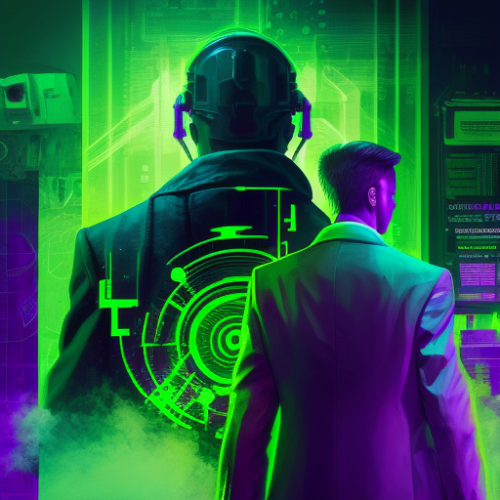 Symbolic figures representing defense, such as shields or personifications of security software. Style: Futuristic, with colors evoking security (blue, green) and digital elements conveying a sense of progress and protection.