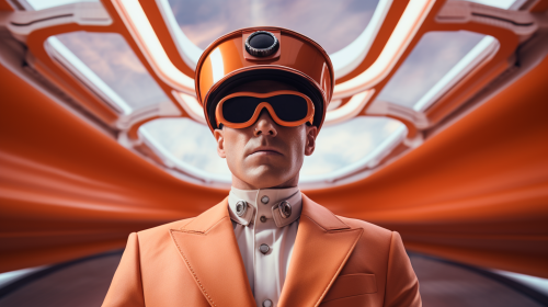 a futuristic cybersecurity male agent dressed in an elegant uniform orange pastel colors, shot as a gucci advertising, futuristic background, Worm’s-eye view, cinematic photo, in the style of movie still, in the style of atmospheric shots, Hasselblad H6D-400C, f/2.8 --ar 16:9