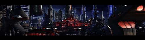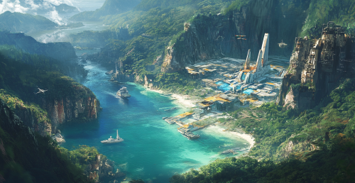 A high tech sci-fi, star wars inspired city sandwiched between a vast, wild jungle and a great sea. The city is relatively small and slowly being overrun by the jungle. There is a small research ship in the sea. Aerial view in the style of video game concept art --ar 64:33