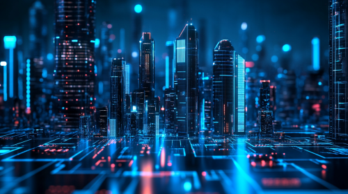 futuristic city landscape overlayed with digital mesh perfectly fited high tech style