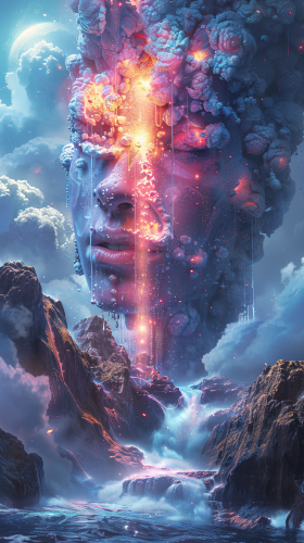 a woman in blue with hair, in the style of vibrant fantasy landscapes, futuristic cityscapes, god rays, uhd image, colorful pixel-art, cybersteampunk, luminous landscape painting, glowing colorful colors, rainbow --chaos 30 --stylize 1000 --ar 16:9 --v 5.2