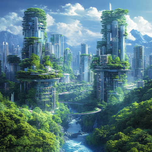 Futuristic cityscape where modern skyscrapers merge organically with nature, buildings wrapped in large trees, green rooftops, and flowing rivers. The city is surrounded by dense forests and towering mountains in the background, with glass and metal architecture emerging naturally from the earth. Vibrant blue skies and lush green landscapes, with urban streets woven seamlessly into the environment, symbolizing harmony between technology and nature. A balance of sleek, modern design with an eco-friendly, natural aesthetic. The overall feel is peaceful, futuristic, and harmonious.