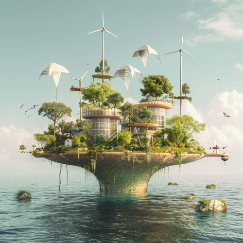 A futuristic green cityscape with towering skyscrapers covered in greenery and vertical gardens. The city features a blend of nature and technology, with solar panels, wind turbines, and trees integrated into the urban environment. The buildings have sleek, modern designs, with lush green plants growing on their facades, creating a sustainable and eco-friendly atmosphere. The streets are clean, lined with greenery and eco-friendly transport solutions, all under a clear, bright sky. --v 6.1 --s 250