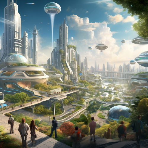 Illustration of a futuristic city in 2050 with towering skyscrapers, flying vehicles, and humans interacting seamlessly with AGI entities. The city skyline showcases diverse people working alongside AGI in harmony, with a blend of nature and advanced technology.