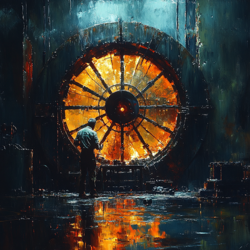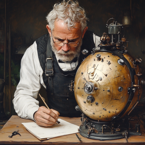 1900's, a man building multiple massive futuristic machines, working on his futuristic machines, old woodwork workshop, curious, focused, discovery, epic scene, dynamic movement, dynamic and epic pose, older aged builder, workshop scenery, cartoon style drawing, cimeatic, epic scenery --c 80 --s 1000