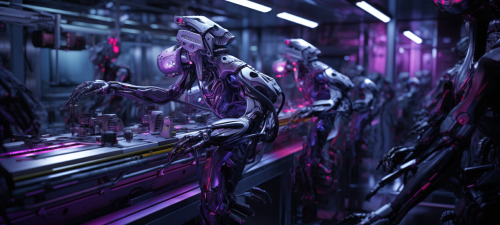 detailed robot workshop, reinforced robots with grey camo metal, purple neon outlines, robots being manufactured, humanoid robots --ar 20:9