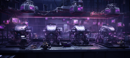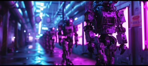 detailed robot workshop, reinforced robots with grey camo metal, purple neon outlines --ar 20:9