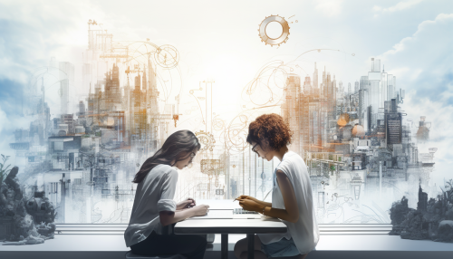 draw in pencil art, two woman engineers making calculations on a paper, futuristic city in the background --ar 7:4