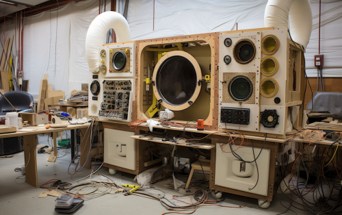 a cargo cult workshop is hand made from reclaimed material: plywood, PVC pipe, wiring from old stereos, etc. to build a retro Nasa-inspired workshop. --ar 8:5
