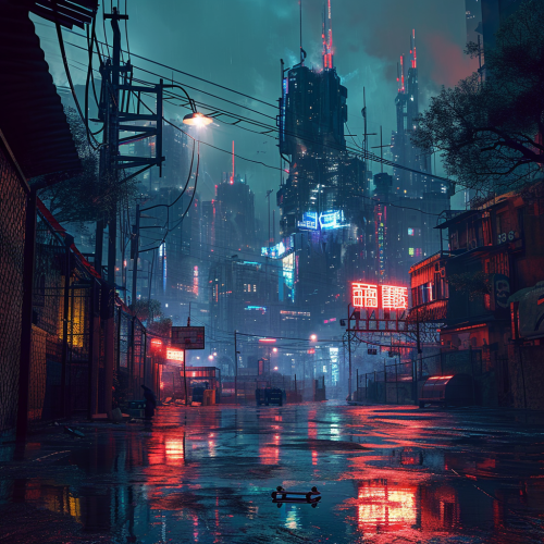 Slums, Asian city with neon shining, huge buildings in the distance, in the park surrounded by futuristic buildings, basketball goal, skateboard, --v 6.0