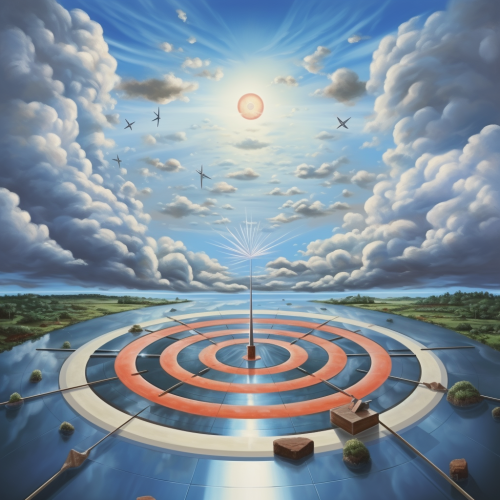 the concept of focus and precision, illustrated by a single, sharp arrow poised at the center of a target. The target is rendered in soft focus, with concentric circles fading into a misty background, drawing the viewer's eye directly to the arrow's tip. The use of a narrow depth of field emphasizes the arrow's clarity against the blurred target, symbolizing the clarity of purpose and the concentration required to hit one's mark in sports and life. --v 6.0